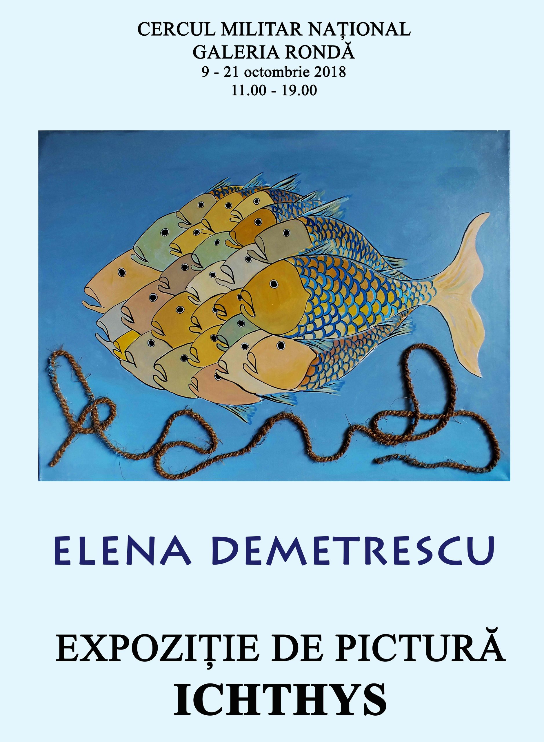 Expoziția de pictură „Ichthys” a artistei plastice Elena Demetrescu, deschisă în perioada 9 – 22 octombrie 2018. Expoziția este vernisată marți, 9 octombrie, ora 17.00, de curatorul expoziției, Emilia Cernăianu, istoric și critic de artă.