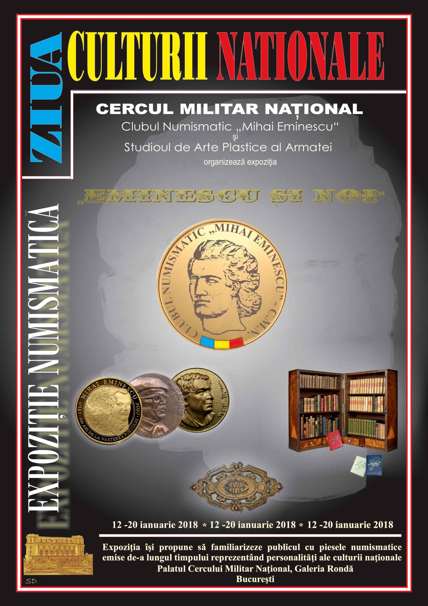 Expoziția de numismatică, grafică și sculptură ”Eminescu și noi”, organizată de Clubul Numismatic ”Mihai Eminescu” din cadrul Cercului Militar Național și Studioul de Arte Plastice al Armatei, cu piese reprezentând personalități ale culturii naționale, deschisă în perioada 12 – 20 ianuarie 2018.