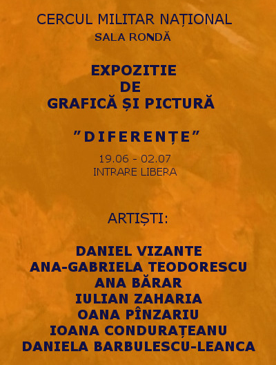 Expoziția de pictură și grafică „Diferențe” a artiștilor plastici Daniel Vizante, Ana-Gabriela Teodorescu, Ana Bărar, Iulian Zaharia, Oana Pînzariu, Ioana Condurățeanu, Daniela Bărbulescu-Leanca, deschisă în perioada 19 iunie – 2 iulie 2018.