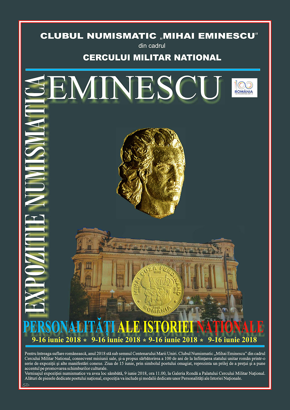 Expoziția numismatică „Personalități ale culturii naționale” organizată de Clubul Numismatic „Mihai Eminescu” din cadrul Cercului Militar Național, care şi-a propus sărbătorirea Centenarului Marii Uniri printr-o serie de expoziţii şi alte manifestări conexe. Ziua de 15 iunie, în care se comemorează 129 ani de la trecerea în neființă a poetului național, reprezintă un prilej de a preţui şi de a pune accentul pe promovarea valorilor culturale. Alături de piesele dedicate poetului Mihai Eminescu, expoziţia include şi medalii dedicate unor personalităţi ale istoriei naţionale. Expoziţia este deschisă în perioada 9 – 16 iunie 2018 și este vernisată sâmbătă, 9 iunie, ora 11.00.