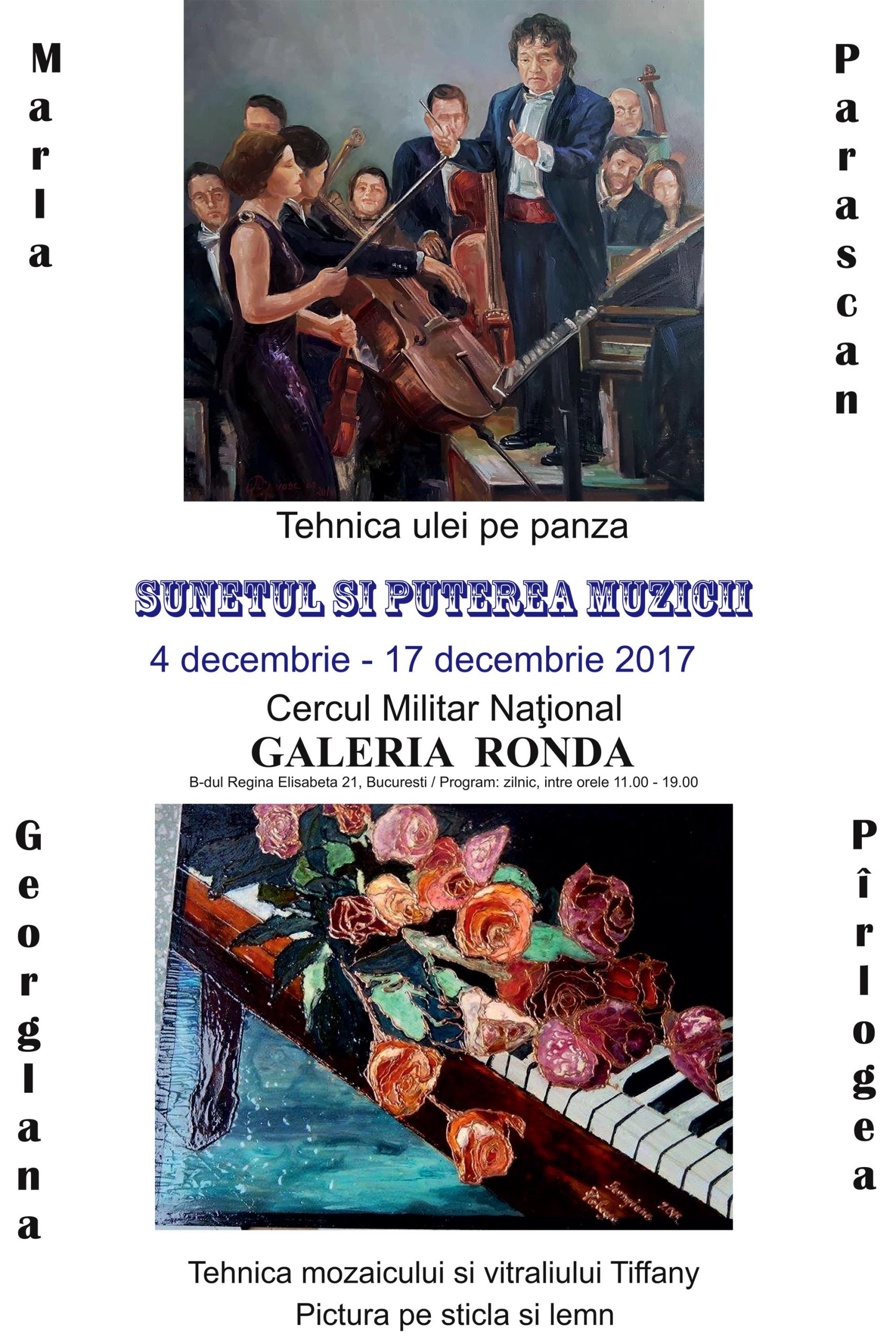 Expoziția artistelor pastice Geta Pîrlogea și Maria Parascan, deschisă în perioada 4 – 17 decembrie 2017. Expoziția cuprinde de lucrări de pictură în ulei, pe sticlă și pe lemn, precum și lucrări realizate în tehnica mozaicului și a vitraliului Tiffany.