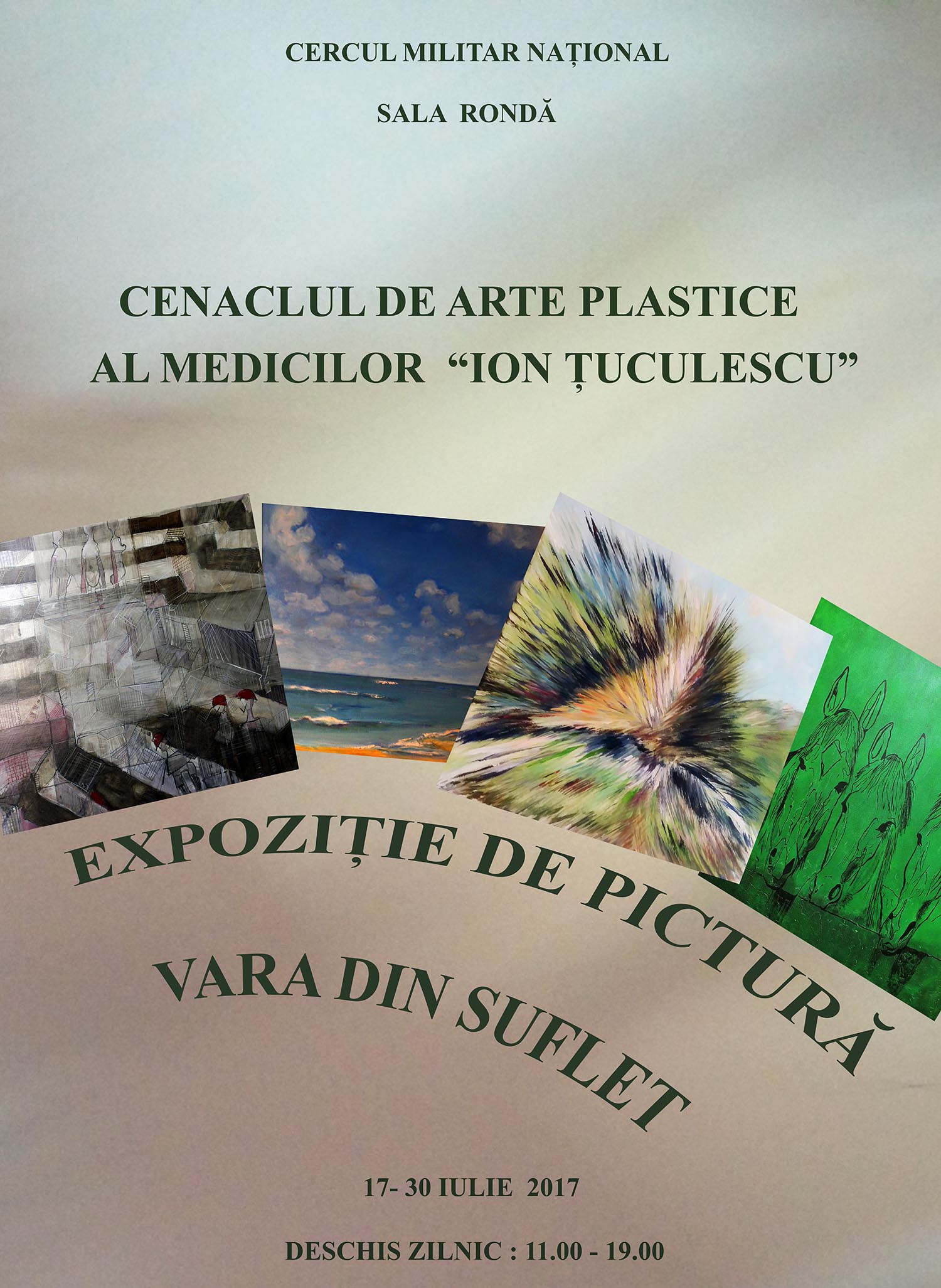 Expoziția de pictură ”Vara din suflet”a Cenaclului de Arte Plastice al Medicilor ”Ion Țuculescu”, deschisă în perioada 17 – 30 iulie 2017. Expoziția este vernisată miercuri, 19 iulie 2017, de către profesorul Nicolae Iorga.