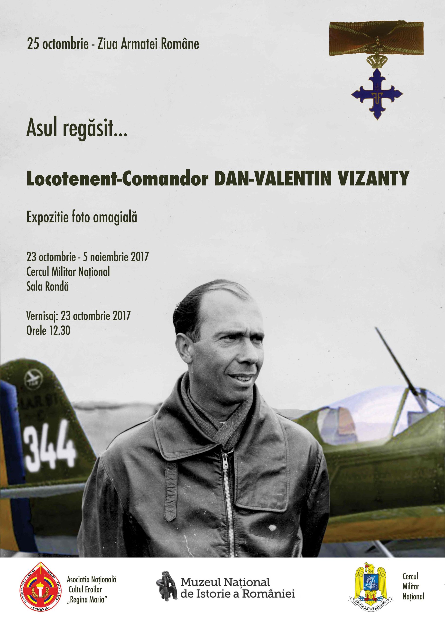 Expoziția de fotografie, documente și obiecte personale”Asul regăsit…Locotenent – Comandor DAN-VALENTIN VIZANTY”. Expoziția este organizată în memoria pilotului de aviație Dan Vizanty, cu ocazia sărbătoririi Zilei Armatei României și este deschisă în perioada 23 octombrie – 5 noiembrie 2017. Eveniment organizat în colaborare cu Asociația Națională Cultul Eroilor ”Regina Maria” și cu Muzeul Național de Istorie al României.