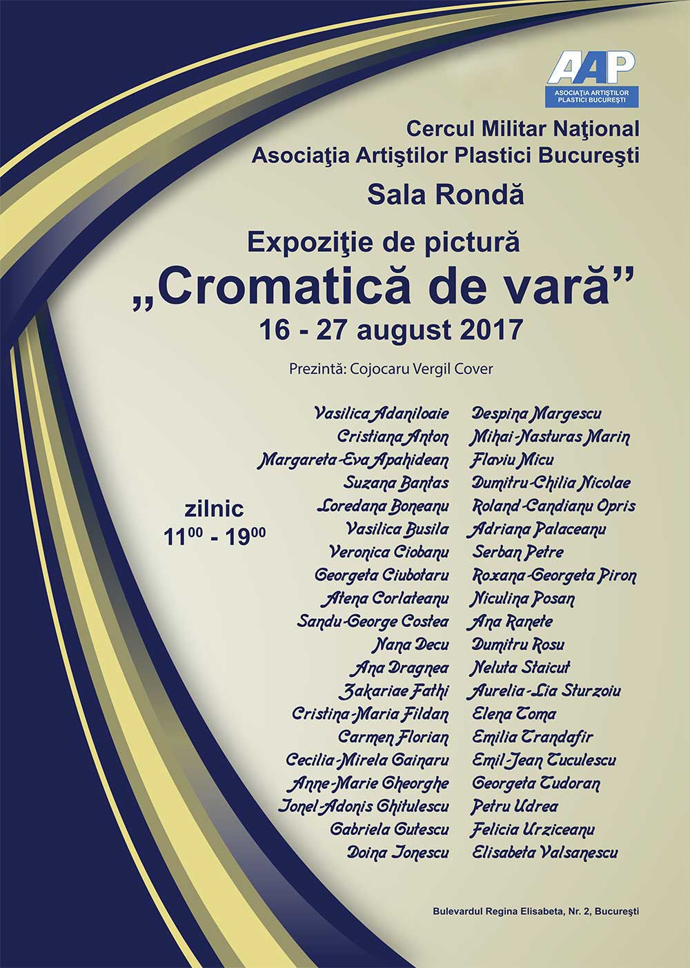 Expoziția de pictură ”Cromatică de vară” a Asociației Artiștilor Plastici București, deschisă în perioada 16 – 27 august 2017.