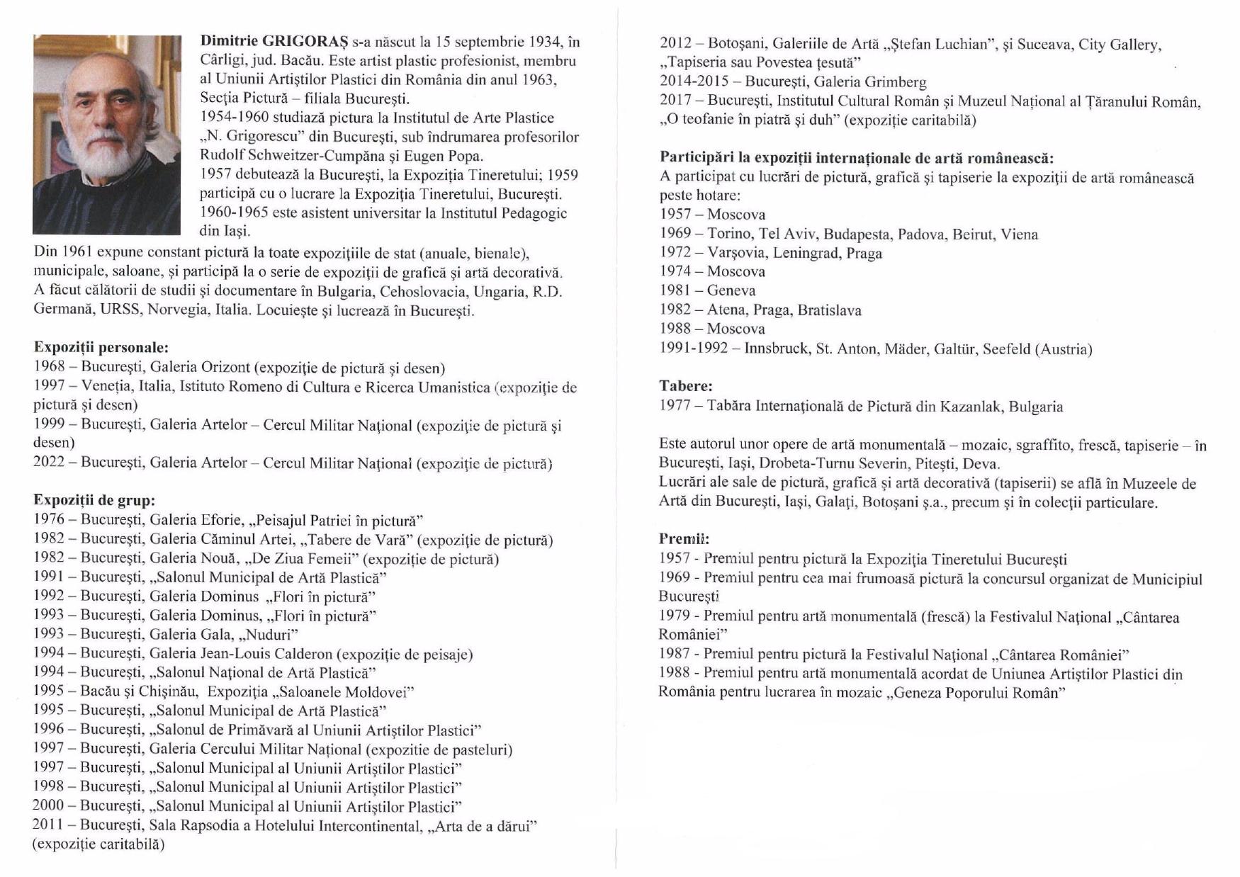 Galeria Artelor a Cercului Militar Național vă invită să vizitați până la data de 19 mai 2022 „ORDINEA CLASICĂ A PRIVIRII”, o expoziție cuprinzând peste 50 de lucrări semnate de artistul plastic Dimitrie GRIGORAȘ, lucrări ilustrând cei peste 60 de ani de activitate artistică. Cu ocazia vernisajului expoziței, la data de 4 mai 2022 a fost lansată și monografia artistului, semnată de istoricul de artă Eduard ANDREI: ,,Dimitrie GRIGORAȘ. Ordinea clasică a privirii” (Editura Paideia, București, 2021). Expoziția este deschisă zilnic, între orele 11.00-19.00. Intrarea liberă.
