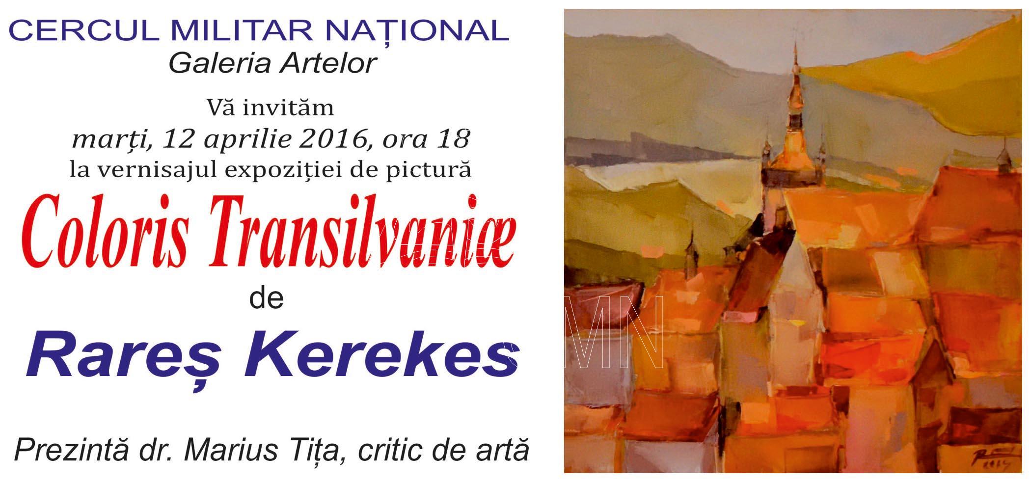 Expoziția de pictură „Corolis Transilvaniæ” a artistului plastic Rareș KEREKES, deschisă în perioada 11 – 28 aprilie 2016. Expoziția este vernisată marți, 12 aprilie 2016, de Marius TIȚA, critic de artă.