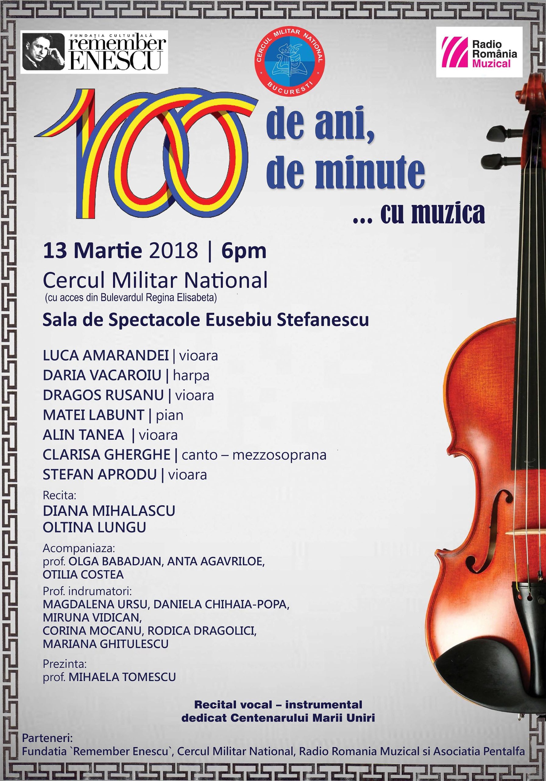Marți, 13 martie 2018, ora 18.00, la Sala de Spectacole ”Eusebiu Ștefănescu”, va avea loc Recitalul vocal-instrumental dedicat Centenarului Marii Uniri. Eveniment organizat de Cercul Militar Național în parteneriat cu Fundația Culturală ”Remember Enescu”.